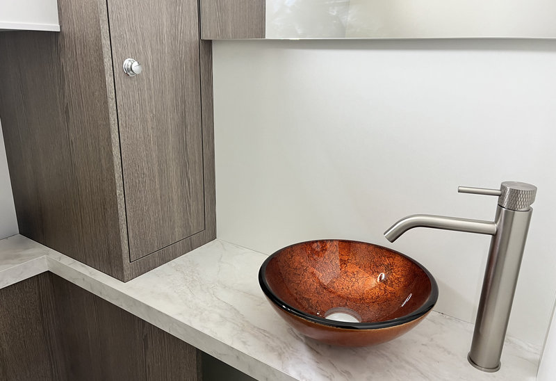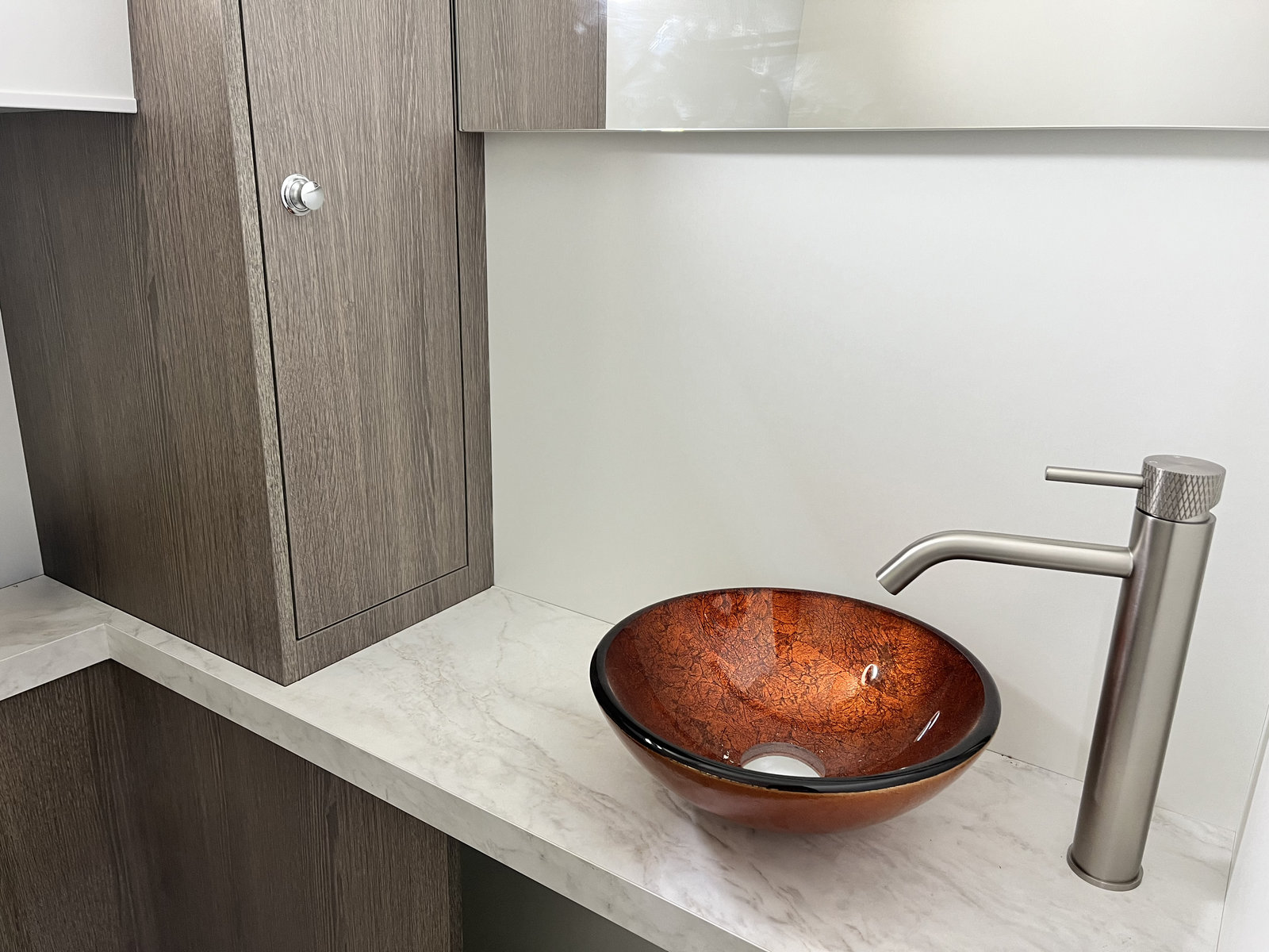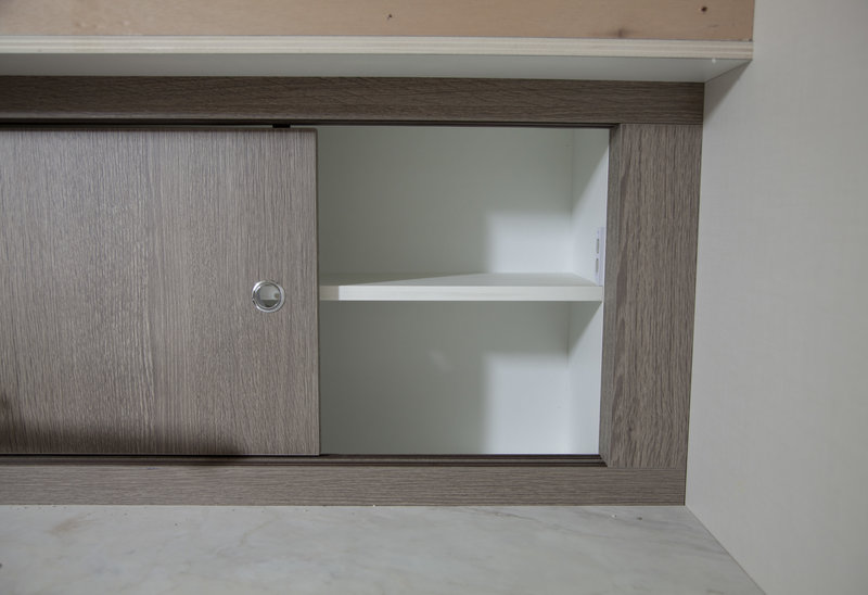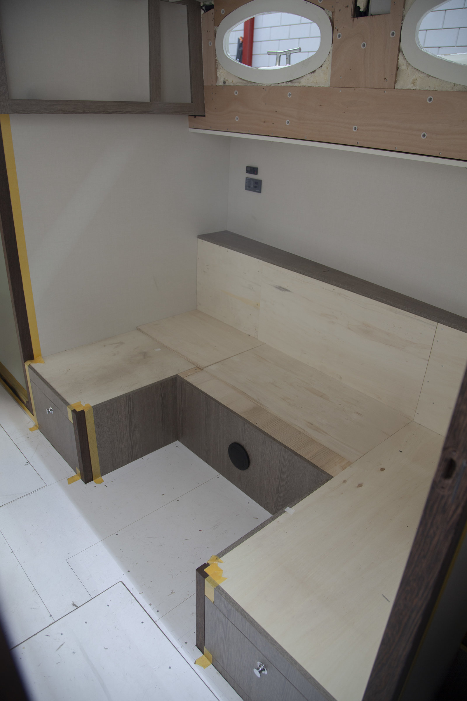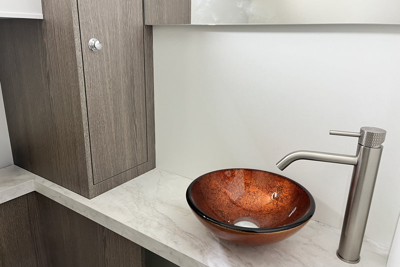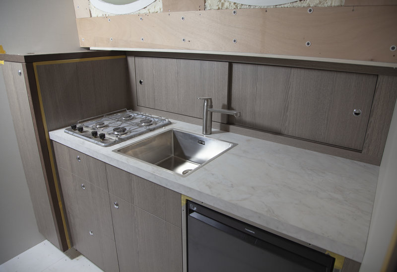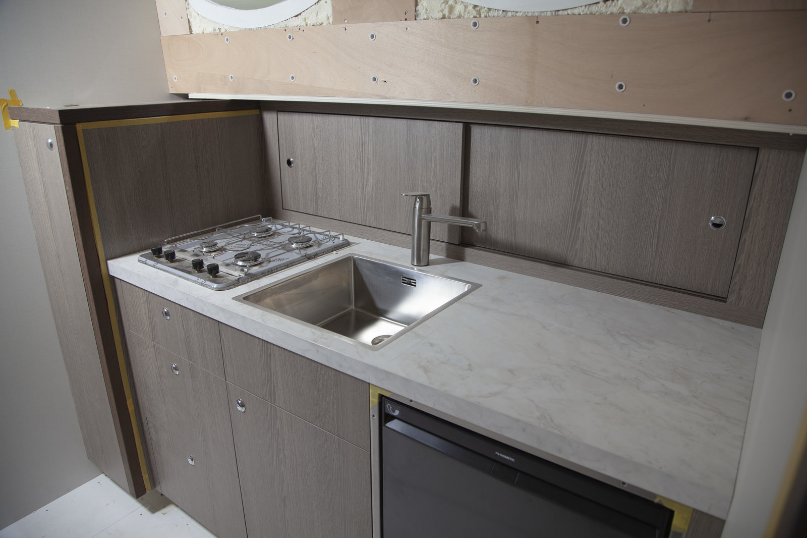 Der Salon ist ein stilvoller Raum zum Entspannen. Das einfallende Tageslicht von oben lässt den Innenraum offen und freundlich wirken. Die Sitzecke kann in einen zusätzlichen Schlafplatz verwandelt werden. Die hochwertig ausgestattete Küche mit Kühlschrank, Gasherd und vollständigem Inventar bietet beste Voraussetzungen für genussvolle Mahlzeiten. Für entspannte Abende steht ein Fernseher zur Verfügung.