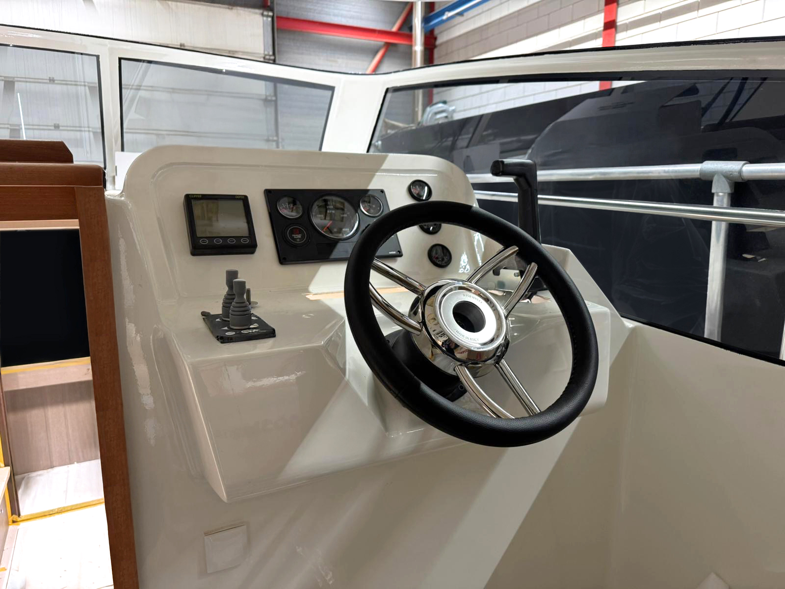 Ob es sonnig oder etwas frischer ist: Mit dem überdachten Steuerstand fahren Sie stets komfortabel. Bei schönem Wetter öffnen Sie die Persenninge vorne und hinten, damit frische Luft sanft hereinströmt. Wird es kühler, schließen Sie die Abdeckungen einfach und sitzen warm und geschützt. Im Steuerstand lässt es sich wunderbar verweilen und dem sanften Plätschern des Wassers zuhören.